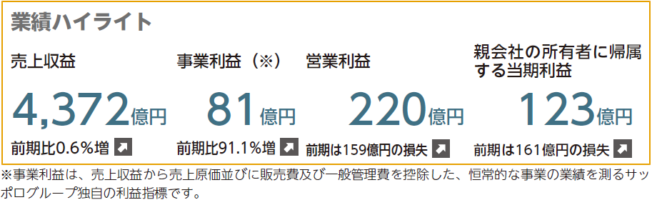 以上の結果、酒類事業の売上収益は2,897億円(前期比43億円、1.5%増)となり、事業利益は54億円(前期比31億円、129.7%増)、営業利益は21億円(前期は49億円の損失)となりました。