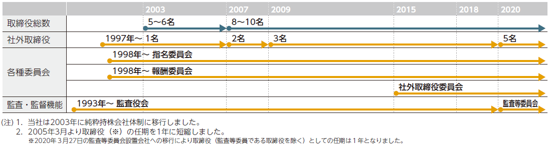 また、当社は、2020年3月に監査等委員会設置会社に移行し、取締役会における独立社外取締役の比率を半数まで高めるなどコーポレートガバナンスを一層充実させることに加え、機動的な意思決定を可能とすることを通じて、さらなる企業価値の向上を図っています。