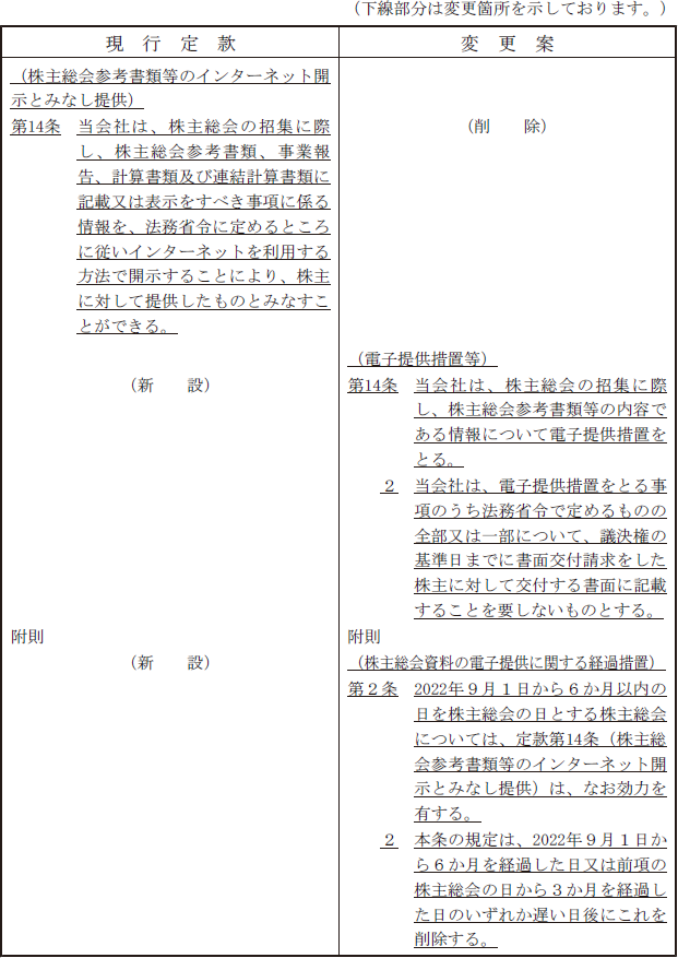 「会社法の一部を改正する法律」(令和元年法律第70号)附則第1条ただし書きに規定する改正規定が2022年9月1日に施行され、株主総会資料の電子提供制度が導入されたことに伴い、次のとおり定款を変更するものであります。